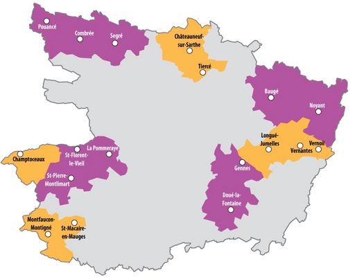 Le transport à la demande a été mis en place en 2011 sur quatre zones (en violet sur la carte ci-dessous). Quatre nouvelles zones (en orange sur la carte) sont ouvertes depuis septembre 2013. À terme, le transport à la demande couvrira 16 zones sur la totalité du Maine-et-Loire (hors périmètre des transports urbains).